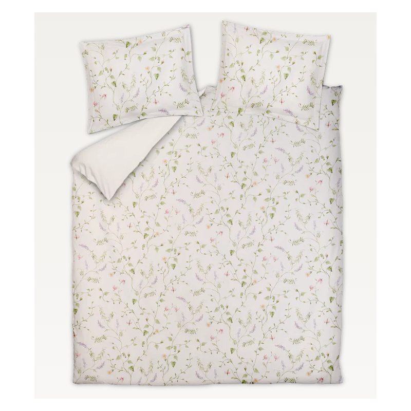 Virella dekbedovertrekset in cream tan is gemaakt van 100% katoensatijn met een 210 threadcount. De soepele luxueuze stof voelt natuurlijk aan en heeft een subtiele glans. Het dessin toont romantische bloemen en blaadjes in waterverf op een cream ondergrond. De achterzijde is effen en heeft een uni achterkant in zachte cream tan kleur daardoor oogt het geheel rustig.