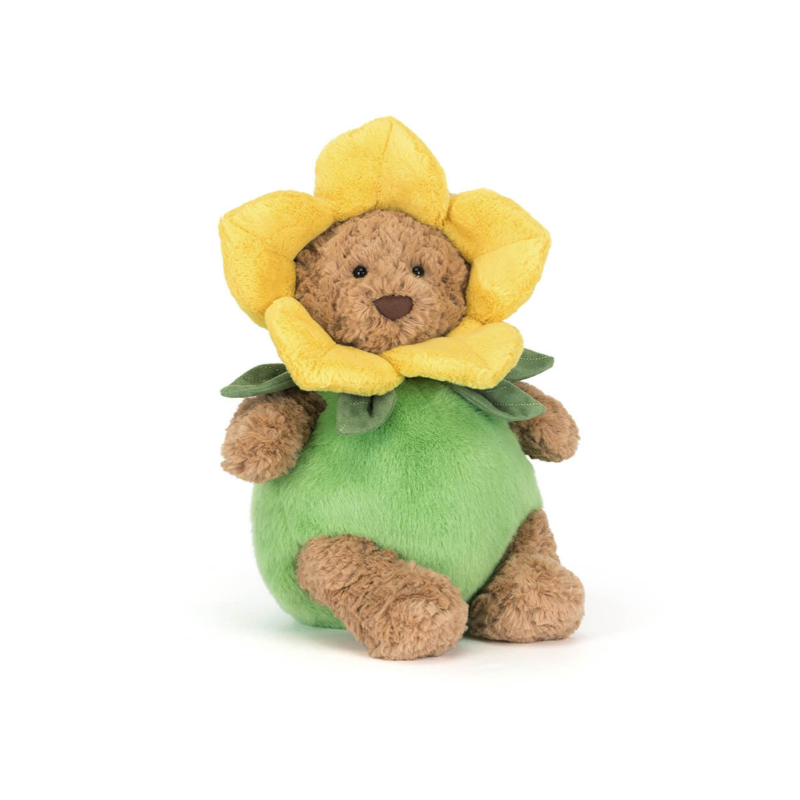 Bartholomew Bear Daffodil Outfit is blooming. Dressed head to toe in his sunny daffodil costume, he’s channelling pure flower power and sharing it generously with everyone he meets – by putting on a spring performance for his friends, naturally!