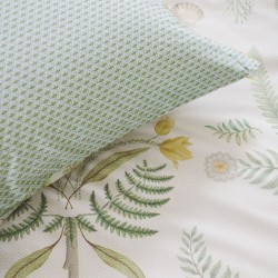 La housse de couette Bamboleo présente une riche collection de plantes et de fleurs botaniques. Les feuilles et les arbres fantaisistes sont soigneusement placés sur la couette, créant un motif de feuillage stylisé. Retournez la couverture et vous y découvrirez un imprimé à carreaux stylisés au dos.