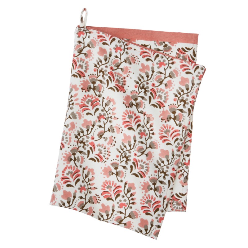 Torchon de cuisine imprimé à la main dans des couleurs rosées. 100 % coton.Les textiles imprimés à la planche sont tous fabriqués à la main et le processus d'impression est long et complexe. Comme vous le découvrirez, chaque pièce du motif est unique. Soyez prêt à accepter les variations de couleur et les irrégularités comme faisant partie du produit. Nous ne les considérons pas comme des imperfections, mais comme de charmants rappels de l'excellence du travail à la main.Nous espérons sincèrement que cette beauté décorative ajoutera de la joie à votre cuisine de bungalow.