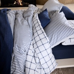 Dekbedovertrekset Flanel Dundee in blue ink toont een klassiek ruitdessin in blauwtinten op grijs mêlé flanel. De achterkant is effen. Het dekbedovertrek is gemaakt van 100% katoenflanel dat zacht en warm is door de licht opgeruwde vezels. Hierdoor voelt het dik en comfortabel aan, terwijl het vocht opneemt en ademend blijft. Een sfeervolle en praktische keuze voor koude maanden.