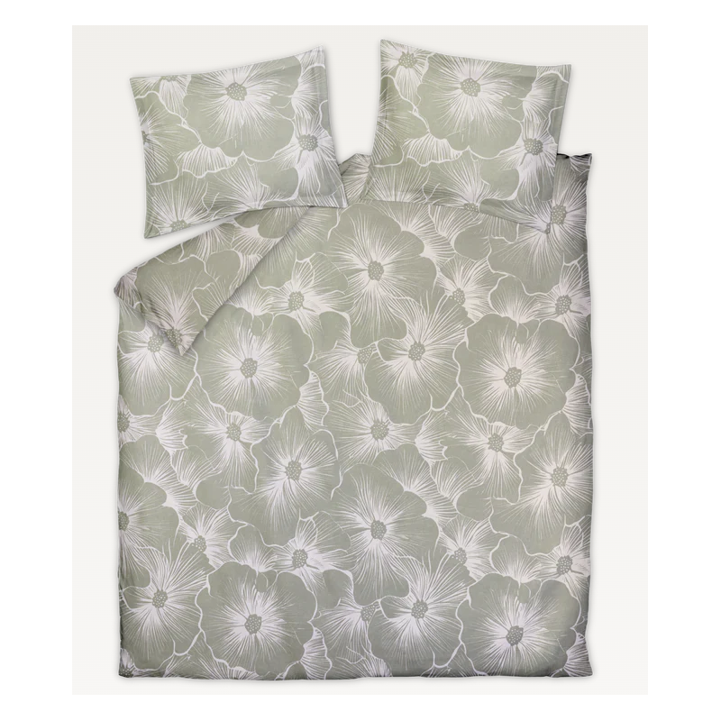 Bloomline dekbedovertrekset in pistache is gemaakt van 100% katoensatijn met een 210 threadcount. De soepele en luxueuze stof voelt glad aan en heeft een subtiele glans. Grote getekende bloemen vullen het dekbedovertrek tegen een diepe groene achtergrond. De print komt aan beide zijden terug voor een krachtig en evenwichtig geheel.