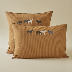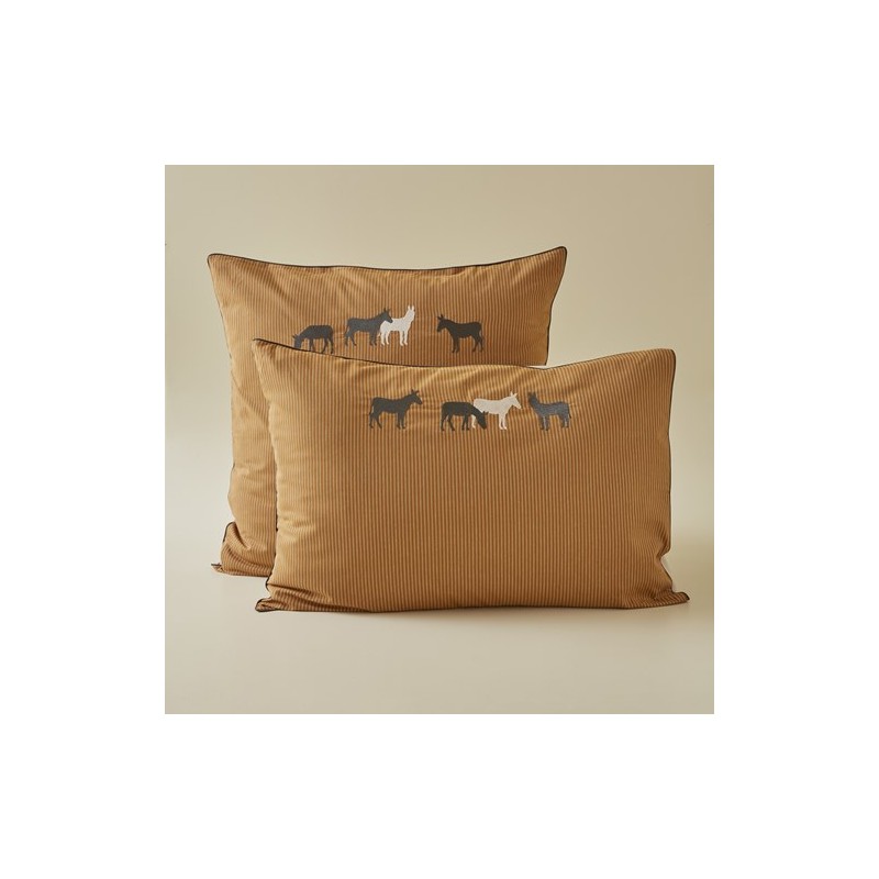 Weet je nog die wandeling door het platteland?De geur van de natuur, het gezang van de vogels, de kleur van de aarde en dan, bij de bocht in het pad, een ontmoeting die een glimlach op je gezicht toverde: een kudde ezels die rustig van het leven genieten.Dat is wat deze kussenslopen oproepen: een zachte manier van leven en authenticiteit.De zwarte en beige ezels zijn geborduurd op een mooie caramelkleurige streep. De zwarte bies rond de kussenslopen voegt een modern tintje toe aan je slaapkamer en creëert een warme en vriendelijke sfeer.Beige katoenen achterkant.